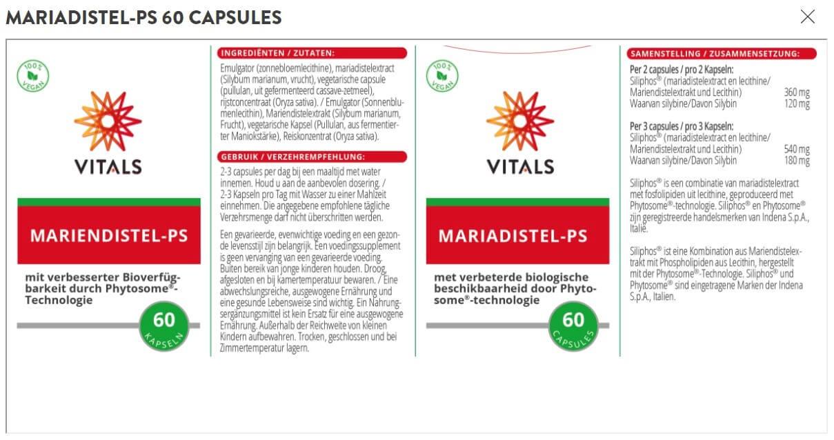 Ingrediënten: Emulgator (zonnebloemlecithine), mariadistelextract (Silybum marianum, vrucht), vegetarische capsule (pullulan, uit gefermenteerd cassave-zetmeel), rijstconcentraat (Oryza sativa).